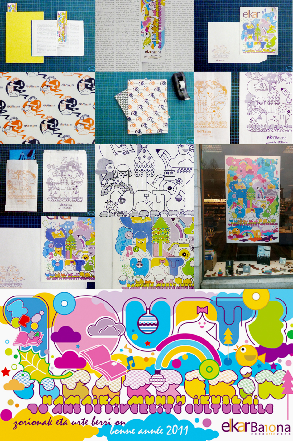 La librería Elkar de Baiona ha cumplido 10 años y nosotros la hemos vestido de Navidad durante las pasadas fiestas. Bolsas de papel, sobres grandes y pequeños, marcapáginas, papel-regalo, el plotter del escaparate y la portada de la revista de Diciembre fueron los elementos que diseñamos con nuestro Universo Elkar... 10 urte Elkarrekin, hamaika mundu ikusgai! :)